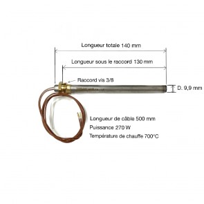 Découvrez la Bougie d'allumage poêle à pellets 270W compatible ADLER - AMG - CALECOSOL - ECOTEK - EMAFLAM - EUROALPI - CALIDEAL - KALOR - PIAZZETTA - QLIMA - RAVELLI - XIANG - longueur 130 mm - diamètre 9,9 mm ! Mettez du feu à votre confort avec notre bougie d'allumage poêle à pellets 270W ! Fiabilité, rapidité et performances garanties pour des soirées chaleureuses. Allumage rapide : En un clin d'il, votre poêle à pellets est prêt à vous réchauffer grâce à la puissance de notre bougie d'allumage. Fiabilité éprouvée : Testée pour 10 000 allumages, notre bougie d'allumage offre une durabilité à toute épreuve pour vous accompagner pendant de nombreuses saisons de chauffage. Compatibilité étendue : Compatible avec les marques renommées ADLER, AMG, CALECOSOL, ECOTEK, EMAFLAM, EUROALPI, CALIDEAL, KALOR, PIAZZETTA, QLIMA, RAVELLI et XIANG, notre bougie d'allumage s'adapte parfaitement à différents modèles de poêles à pellets d'autres marques également. Puissance et efficacité: Profitez de la puissance impressionnante de notre bougie d'allumage poêle à pellets 270W. Grâce à sa température d'allumage de 700°C, elle garantit une combustion rapide et efficace de vos pellets. Plus besoin d'attendre longtemps pour profiter d'une chaleur enveloppante dans votre intérieur. Avec cette bougie d'allumage performante, vous pouvez dire adieu aux départs difficiles et aux flammes capricieuses. Chauffez votre maison en toute confiance, même lors des froids les plus rigoureux. Robustesse et durabilité : Notre bougie d'allumage poêle à pellets est conçue pour durer. Fabriquée avec des matériaux de haute qualité, elle est résistante aux températures élevées et aux contraintes quotidiennes. Grâce à sa construction solide, elle peut être utilisée pour remplacer toute bougie d'allumage ayant les mêmes caractéristiques. Vous bénéficiez ainsi d'une solution fiable et économique, sans avoir à vous soucier des pannes d'allumage récurrentes. Profitez d'une chaleur constante et agréable sans tracas. Facilité d'installation: L'installation de la Bougie d'allumage poêle à pellets est un jeu d'enfant. Son raccord à vis 3/8 s'adapte facilement à votre poêle à pellets, vous permettant ainsi de gagner du temps et de l'énergie lors du remplacement. Que vous soyez bricoleur aguerri ou débutant, vous apprécierez la simplicité de cette opération. En quelques étapes simples, vous pourrez profiter d'un allumage fiable et rapide, sans avoir besoin de faire appel à un professionnel. Simplifiez-vous la vie avec cette bougie d'allumage pratique. Garantie et tranquillité d'esprit: Profitez d'une garantie d'un an sur la Bougie d'allumage poêle à pellets 270W pour une tranquillité d'esprit totale. Nous sommes convaincus de la qualité de notre produit et de sa durabilité exceptionnelle. En choisissant notre bougie d'allumage, vous investissez dans un produit fiable qui vous accompagnera tout au long de vos hivers. Ne laissez pas les soucis d'allumage gâcher votre expérience de chauffage.
